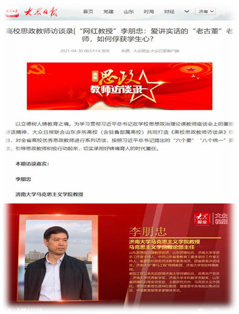 李朋忠教授的课堂总是座无虚席,他的思政课趣味十足,内容丰富。一组组数字、随口而出的古诗、从历史典故到最新热点,理论知识被他讲得通俗易懂。他常说,把深奥的道理用深奥的语言说出来不是水平,把深奥的道理用通俗易懂的语言表达出来才见功夫。对学生所反映的具有共性的问题,他总会在课堂上细心讲解,对于非共性问题,课后找学生单独交流与沟通。“师者,传道授业解惑者也!”他如是说,“只有会质疑才会有创新。”他在授课过程中注意和学生的互动与交流,注意给学生思考的空间,利用各种办法帮助学生学会质疑。